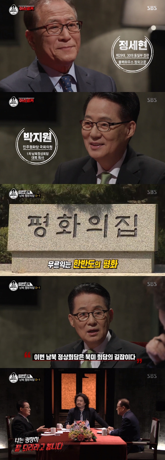 26일 오후 방송된 SBS '김어준의 블랙하우스'의 코너 '이수벙커'에선 '남북정상회담 D-1'이란 주제로 꾸며졌다. 오는 27일 남북정상회담을 앞두고 정세현 전 통일부 장관, 박지원 민주평화당 국회의원이 출연해 남북정상회담에 대한 이야기를 나눴다.