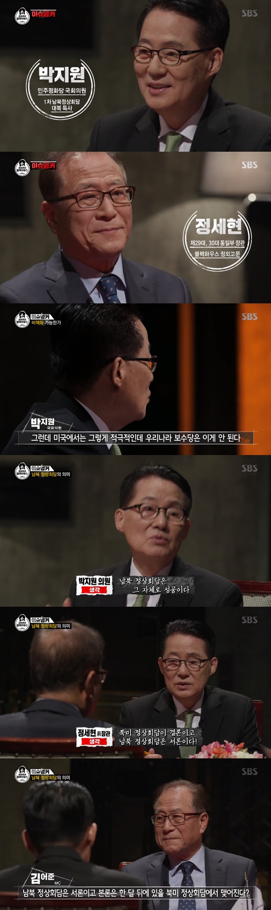이날 '이슈벙커' 코너에는 정세현 전 통일부 장관, 박지원 민주평화당 국회의원이 출연해 남북정상회담에 대한 이야기를 나눴다.