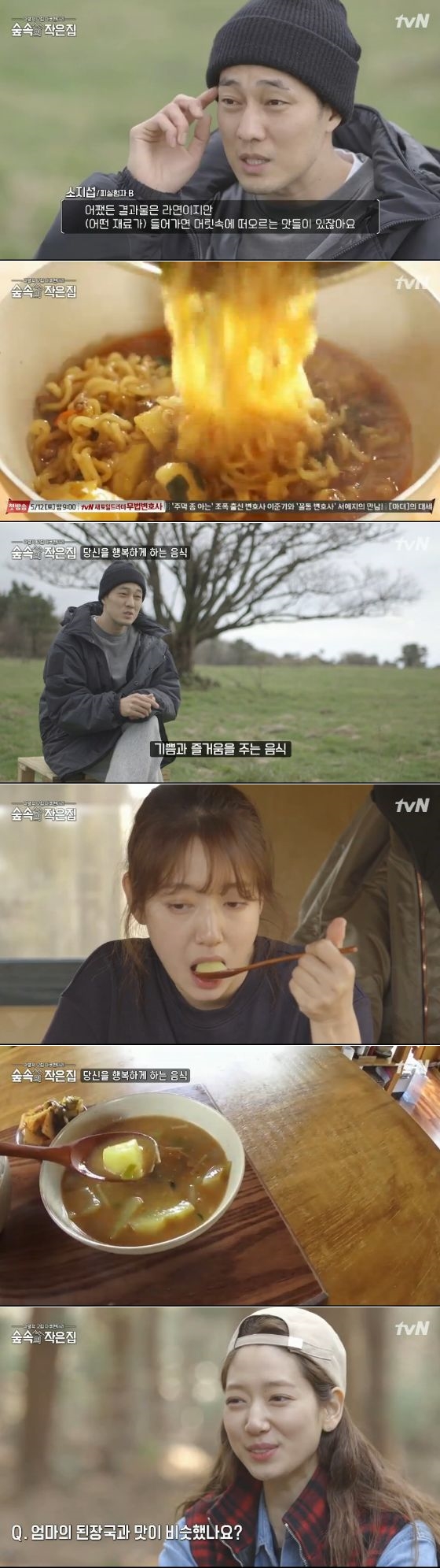 27일 방송된 tvN '숲 속의 작은 집'에서 피실험자 박신혜와 소지섭은 자신을 행복하게 할 추억이 담긴 음식을 만들어 먹어보라는 미션을 받았다.