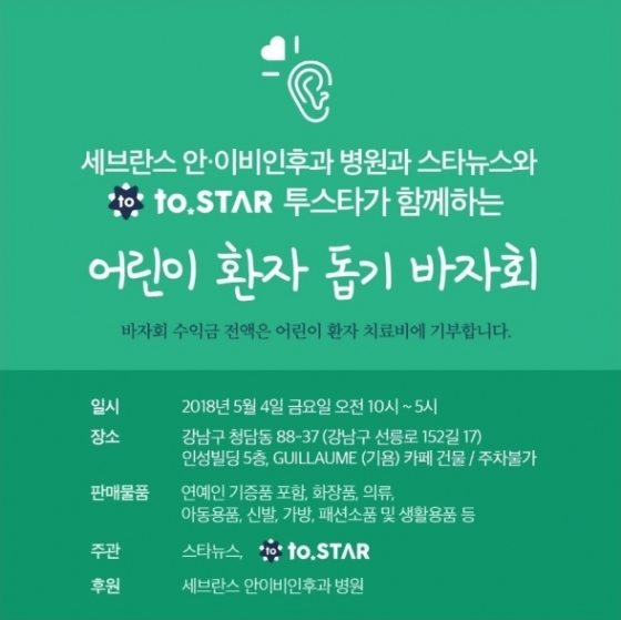 어린이 환자를 돕기 위해 세브란스 안이비인후과 병원과 스타뉴스, 투스타(to.STAR)가 함께 하는 '어린이 환자 돕기 바자회'가 오늘 개최된다.