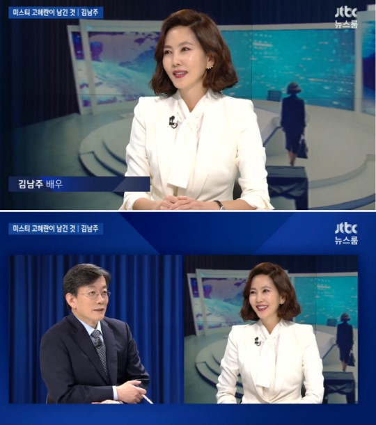 김남주는 9일 오후 방송된 '뉴스룸'에 출연했다. 김남주는 지난 3월 종영한 드라마 '미스티'에서 대한민국 최고의 앵커 고혜란 역으로 열연을 펼친바 있다. 때문에 출연 전부터 손석희와 김남주의 만남을 고대하는 팬들의 기대를 한몸에 받았다.