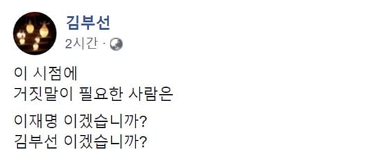 김부선은 11일 오전 자신의 페이스북에 "이 시점에 거짓말이 필요한 사람은 이재명이겠습니까? 김부선이겠습니까?"라고 물었다.