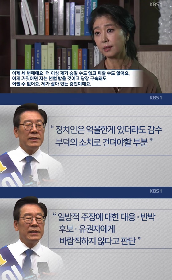 지난 10일 방송된 KBS 1TV '뉴스9'에 출연한 김부선은 이재명 후보와 관계에 대해 "거짓이면 저는 천벌을 받을 것"이라며 "당장 구속돼도 어쩔 수 없다. 제가 살아있는 증인"이라고 주장했다.
