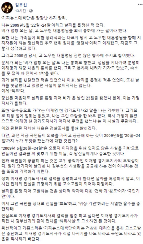 김부선은 "나는 2009년 5월 '22일~24일'이라고 날짜를 특정한 적 없다. 비가 엄청 오는 날, 고 노무현 대통령님을 뵈러 봉하에 가는 길이라 했다"며 "이날 나는 봉하로 향했고, 성남을 지나가며 분명히 이재명과 해당 내용의 통화를 했다. 그리고 봉하에 내려가 기자도 만났고, 숙소를 못 잡아 차 안에서 1박을 했다"고 주장했다.