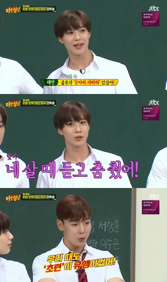 그룹 샤이니의 태민이 4살 때 그룹 클론의 노래를 듣고 춤을 췄다고 밝혔다.
