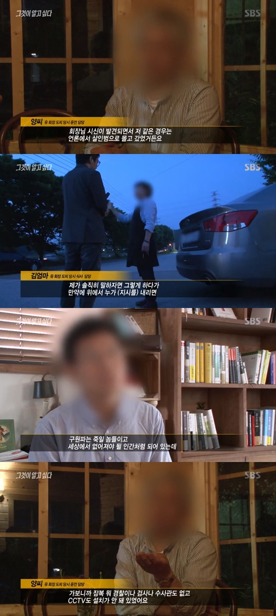 '그것이 알고 싶다'는 기독교복음침례회 유병언의 도피를 도운 이른바 도피 5인방 중 몇몇을 만났다. 당시 운전을 도운 양모씨와 식사를 도운 김 엄마는 "힘든 시간을 보냈다"고 말했다.