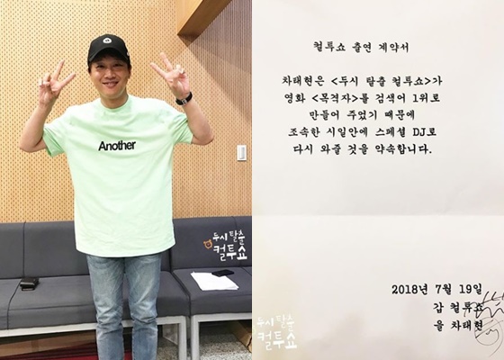 SBS 라디오 파워FM '두시탈출 컬투쇼' 측은 19일 공식 인스타그램에 "오늘 스페셜 DJ 차태현 씨가 방송 중에 검색어 공약을 했었죠. 이때다 싶어 문서로 남겨놓았습니다. 저희가 이럴 때만 발 빠릅니다. 피디가 퀵실버. 갑 컬투쇼. 을 차태현. 곧 다시 만나요. 영화 '목격자' 많이 사랑해주세요"라는 글과 함께 사진을 게재했다.