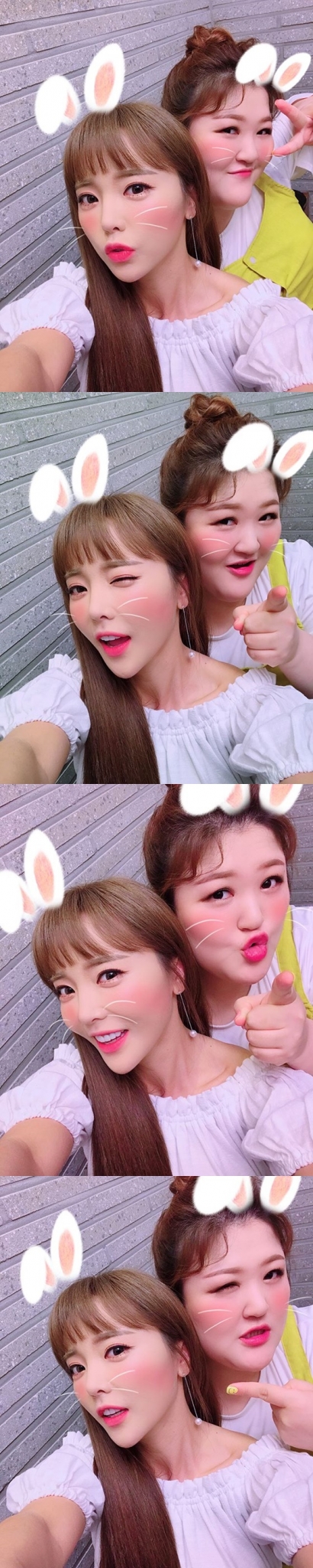 공개된 사진 속 이국주는 홍진영과 함께 귀여운 포즈로 카메라를 응시하고 있다. 특히 이들은 애플리케이션을 이용해 셀카를 찍어 보는 이들의 시선을 모았다.