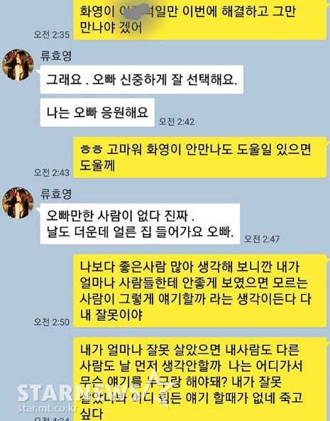 메시지에는 엘제이가 류효영에게 "화영이 그만 만나야겠어"라고 하자 류효영이 "그래요 오빠 신중하게 잘 선택해요. 나는 오빠 응원해요"라고 적혀있다.