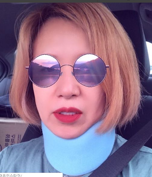 사진 속 박미선은 목 기브스를 하고 카메라를 응시하고 있다. 안경 모양 스티커와 레드립이 눈길을 사로잡는다.