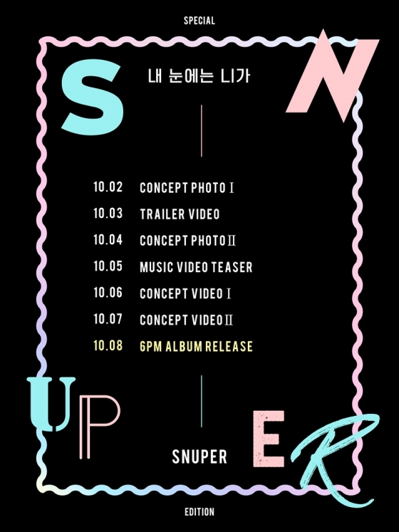 스누퍼는 1일 공식 SNS 채널을 통해 새 앨범 'Special Edition 내 눈에는 니가'의 컴백 스케줄러를 공개하며 기대감을 높였다. 공개된 스케줄러에 따르면 '내 눈에는 니가' 콘셉트 포토 공개를 시작으로 트레일러 비디오, 뮤직비디오 티저, 콘셉트 비디오까지 다양한 컴백 콘텐츠가 순차적으로 공개될 예정이다.