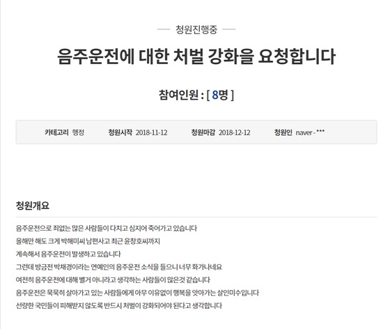 박채경의 음주운전에 대한 논란으로 등장한 이 청원글에 대한 반응은 아직 잘 알려지지 않아서인지 동의자가 미미한 수준(13일 오후 1시 54분 기준 8명)이다. 청원에 대한 반응은 작지만 최근 거듭 사회적으로도 문제가 되고 있는 음주운전에 대한 경각심을 다시 한 번 일깨우고 있다.