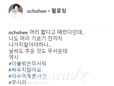 오초희는 인스타그램에 "머리 짧다고 때렸다던데. 나도 머리 기르기 전까지 나가지 말아야 하나. 날씨도 추운 것도 무서운데. 역시"라는 글과 '이불 밖은 무서워' '싸우지 말아요' '이수역 폭행사건' '무시라'(무서워라) 등의 해시태그를 게재했다. 또 관련 글을 썼던 작성자가 공개한 사진도 올렸다.
