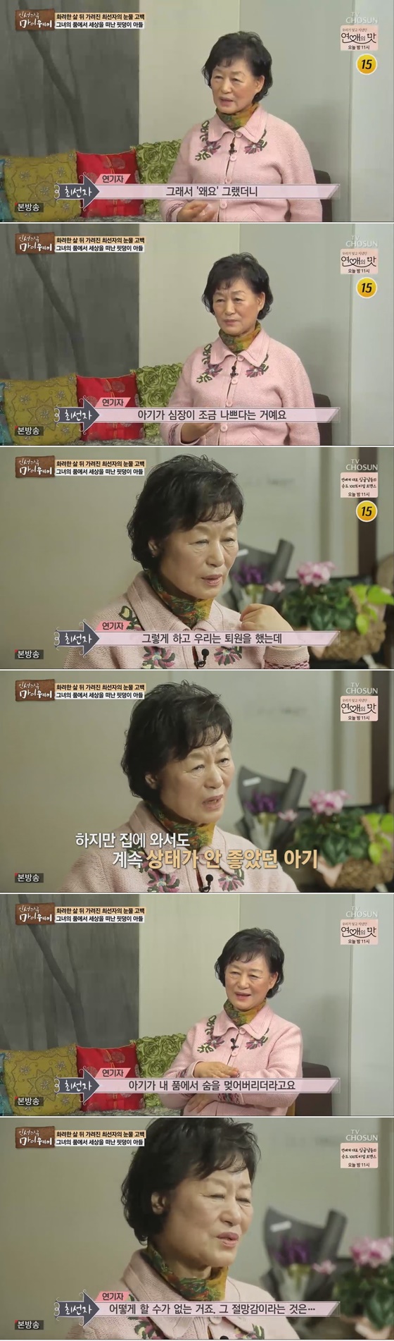 배우 최선자가 자신의 품에서 핏덩이 아들이 숨을 거뒀다고 털어놨다.