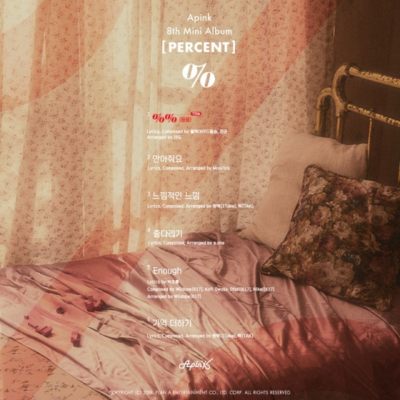 에이핑크는 컴백을 앞두고 'PERCENT'의 콘셉트 포토, 롤링 뮤직, 뮤직비디오 티저 등 화려한 볼거리를 제공해 뜨겁게 달굴 예정이다.