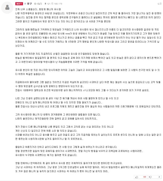 이어 "이런 본인의 입장 때문에 또 다른 상처가 되신 분들께 너무 죄송하며 광희씨와 많은분들께 더 큰 피해를 드리기 전에 퇴사를 결정했으며 앞으로 이번 일을 계기로 지난 시간을 반성하며 더욱 성숙하고 열심히 생활 할 수 있도록 노력하겠다고 말했다"며 기회가 된다면 앞으로 어린시절 본인에게 상처를 입은 분들을 직접 만나 사과 할 수 있도록 하겠다고 말한 입장을 대신 밝혔다.