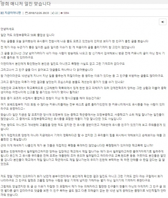 하지만 방송 다음날인 23일 한 온라인 커뮤니티 게시판에는 유 씨가 과거 중학교 시절 의정부에서 학생들을 괴롭히는 일진 중 한 명이었다고 주장하는 글이 올라왔다. 네티즌은 "진짜 너무 소름돋는다 황광희 매니저"라며 "(황광희 매니저는)나랑 의정부중학교 동창이고 90년생 29살입니다. 의정부에서 초중고 다나왔고 일진이었고 근처 학군 통 틀어서도 가장 잘나가는 일진 중 한명이었습니다"라고 글을 올린 것.