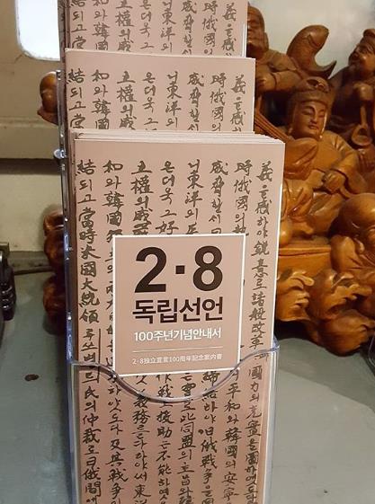 그리하여 배우 송혜교 씨와 또 힘을 모아 '2.8독립선언 100주년 기념 안내서'를 한국어와 일어로 제작하여, 젊은층이 많이 이용하는 도쿄 시내 민박집 10곳에 1만부를 기증했습니다.