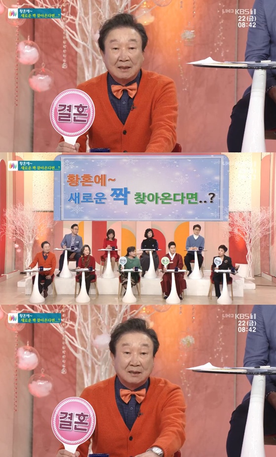 22일 오전 방송된 KBS 1TV 교양프로그램 '아침마당'의 '공감토크 사노라면' 코너에서는 윤문식 지영옥 이만기 장미화 남상철 서권순 등이 출연해 '황혼에 새로운 짝이 찾아온다면'을 주제로 이야기를 나눴다.