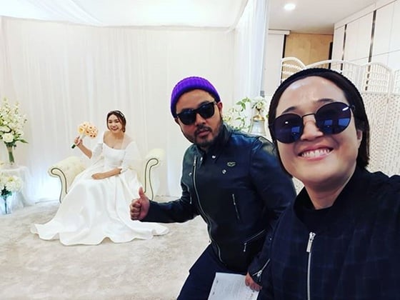 사진 속에는 이진아가 있는 신부 대기실을 찾은 송은이와 심태윤의 모습이 담겨있다. 우아한 웨딩드레스를 입은 이진아와 선글라스를 쓴 심태윤 송은이의 모습이 눈길을 끈다.