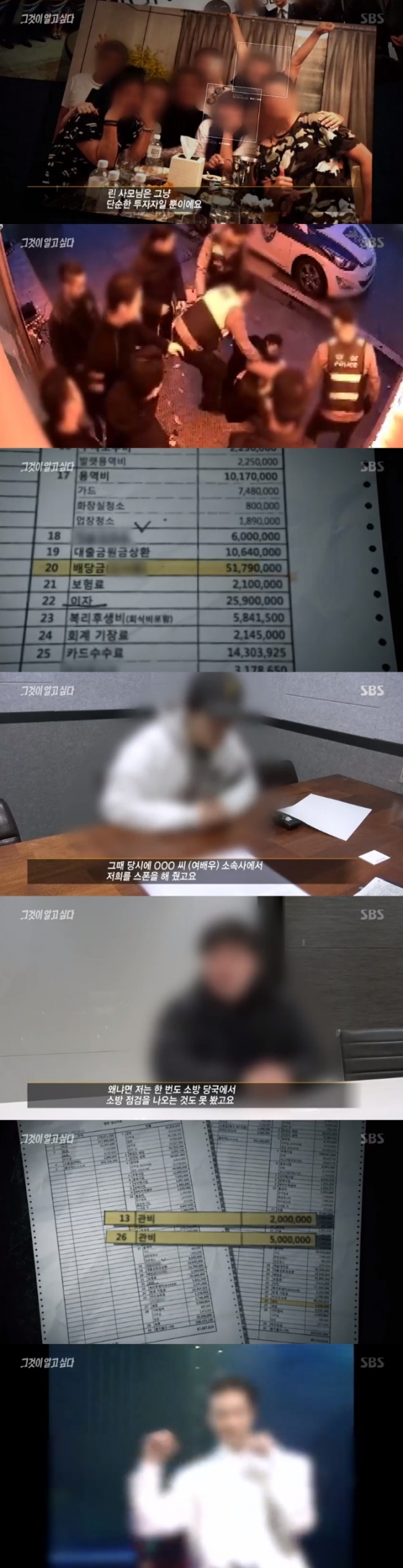버닝썬 전 직원은 "공무원과도 유착이 있을 것이다. 한 번도 소방당국에서 온 걸 본 적이 없다"고 말했고, 또 다른 전 직원은 "당시 영업 정지도 당했다. 호텔 사우나권 200만 원을 끊어서 공무원 집에 배달해줬다"고 증언했다. 매달 200만 원에서 많게는 500만 원까지 '밤의 해결사'인 전직 형사 강씨에게 배달됐다는 것이었다.
