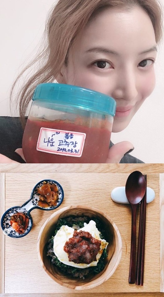 사진 속 윤세아는 김나운이 보내준 볶음 고추장을 들고 카메라를 응시하고 있다. 특히 두 번째 사진에서 볶음 고추장 비빔밥은 보기만 해도 군침이 돌게 해 눈길을 끈다.