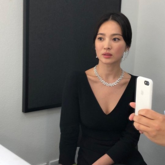 공개된 사진 속에는 송혜교가 대기실에서 인증샷을 찍고 있는 모습이 담겼다. 송혜교는 검은색 드레스를 입고 깊은 목선을 드러냈다. 특별한 포즈를 취하지 않아도 빛나는 송혜교만의 우아함이 눈길을 끈다.