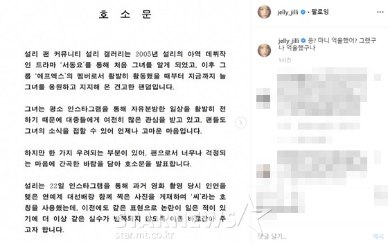 설리는 22일 오후 자신의 인스타그램에 "난 의성씨랑 처음 만난 날 친구하기로 해서 그때부터 호칭을 설리씨 의성씨로 정했다. 그리구 성민씨도 정근씨 해진씨 철민씨 성웅씨 원해씨 모두. 우린 서로를 아끼는 동료이자 친구다♥ 내가 알아서 하면 했지 발끈하기는"라는 글을 게재했다.