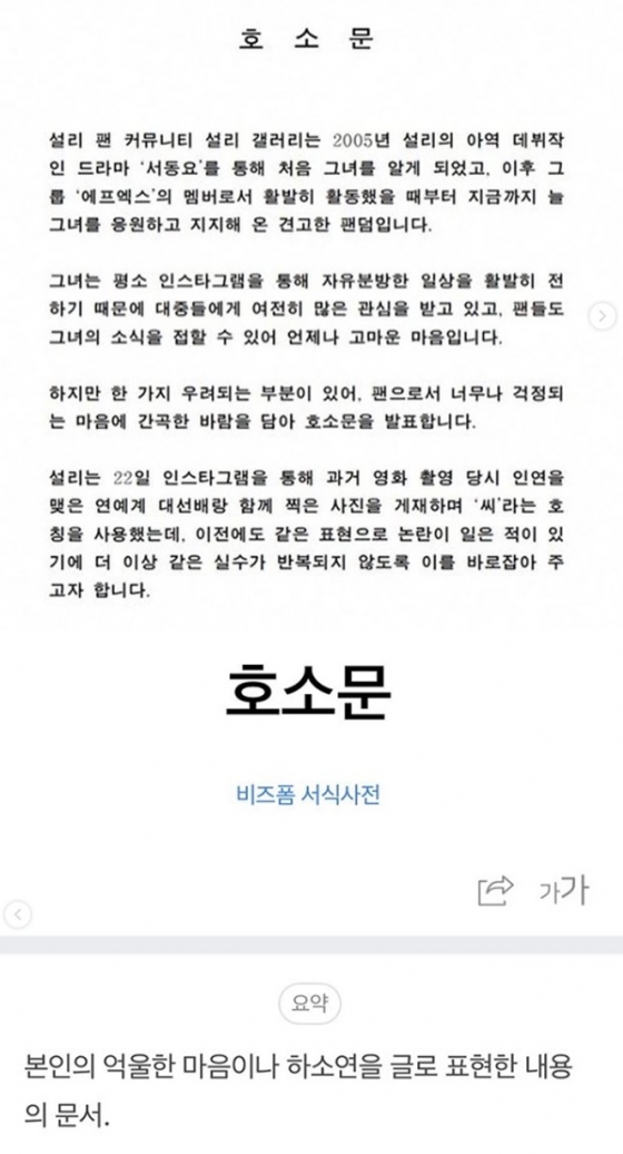 또한 설리는 온라인 커뮤니티 디시인사이드 '설리 갤러리'에 올라온 호소문에 대해서도 "응? 마니(많이) 억울했어? 그랬구나. 억울했구나"라며 오히려 팬들의 설리 SNS 행보 지적을 비꼬았다.