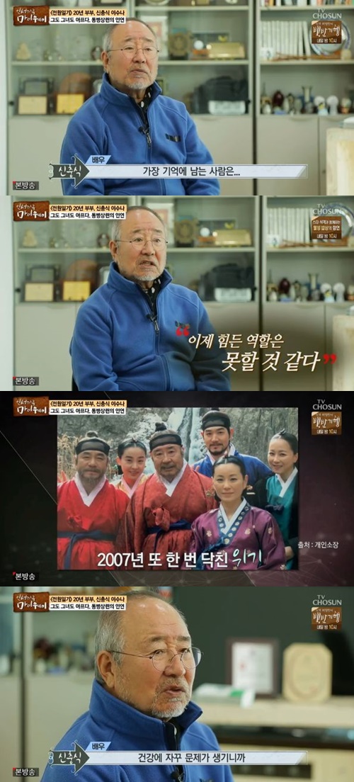 이후 또 한 번 위기가 찾아왔다고 고백한 신충식은 "드라마 '이산'을 촬영하면서 건강이 안 좋아졌다. 그래서 이병훈 감독에게 '도저히 못 하겠다'고 부탁해 중도하차 했다. 그때부터 이제 힘든 역할은 못할 것 같다는 생각이 들었다. 제가 주인공도 아니었고, 또 할 만큼 했고, 건강에 자꾸 문제가 생기니까 그래야겠다는 결심을 했다"고 설명했다.