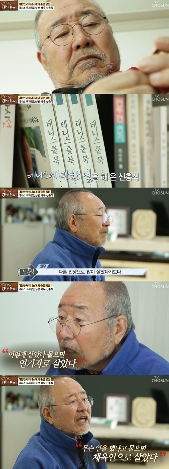 이에 대해 신충식은 "연기자 외에 또 다른 활동도 많이 했다"라는 제작진의 질문에 "저는 '어떻게 살았냐'라고 물으면 '연기자로 살았다'라고 대답하고, '무슨 일을 했냐'라고 물으면 '테니스인, 체육인으로 살았다'"라고 자신의 인생을 정의했다.