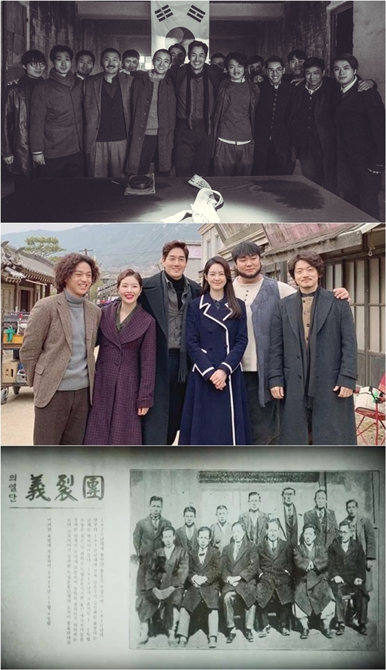 이 가운데 한 온라인 커뮤니티 사이트에는 유지태(김원봉 역), 조복래(김남옥 역)를 비롯한 극중 의열단의 출정식 모습과 실제 의열단을 비교하는 사진이 등장해 화제다.
