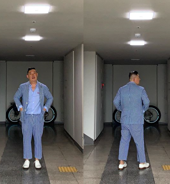 스타일리스트 신우식이 '파란 바둑판룩'을 선보였다.