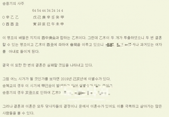'사주논리여행' 블로그를 운영 중인 역술가가 지난 2017년 게재했던 글에는 송혜교와, 송중기의 사주에는 "2019년 이별수가 있다"는 내용이 담겨 있다.