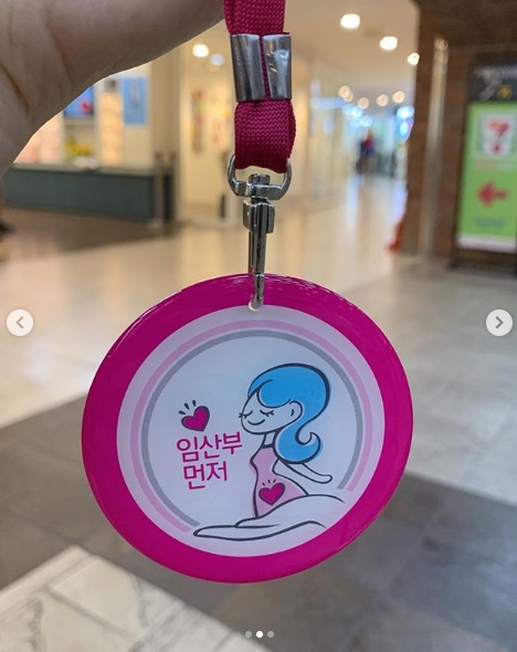 사진 속에는 태아 축복식 인증 모습과 '임산부 먼저'라는 '임산부 배려 엠블럼'을 받아든 모습이 담겨 있었다.