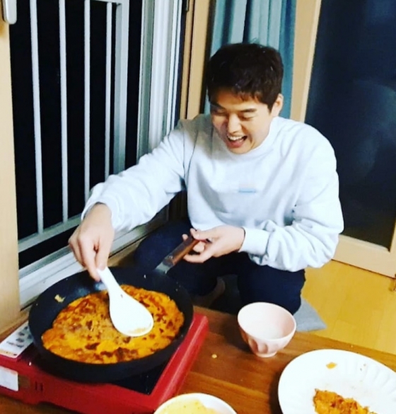 공개된 사진 속 권혁수는 김치전을 부치며 행복한 듯 얼굴 가득 웃음꽃이 피어있다.