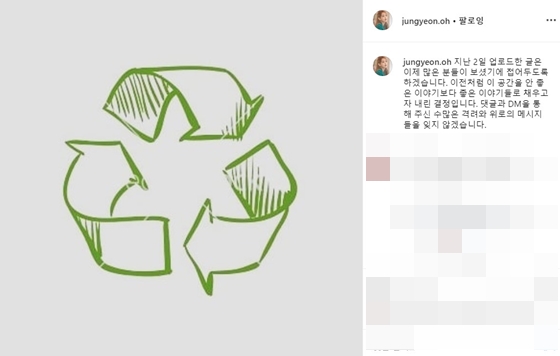 그는 "이전처럼 이 공간을 안 좋은 이야기보다 좋은 이야기들로 채우고자 내린 결정입니다. 댓글과 DM을 통해 주신 수많은 격려와 위로의 메시지들을 잊지 않겠습니다"는 글도 남겼다.