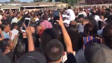 교회의 주차장에서 청중들이 모여 몸을 흔들며 노래를 따라부르는 와중 브래드 피