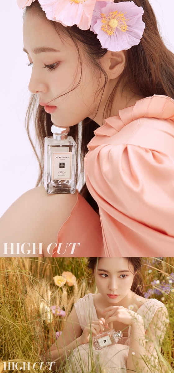 따뜻한 보리와 파스텔톤 포피 꽃 그리고 이름 모를 들꽃 사이에 마치 세경 꽃이 피어난 것 같은 풍경이었다. 속이 비칠 듯 투명한 피부, 곧 뚝하고 물방울이 떨어질 듯 청아한 눈빛은 비현실적일 정도로 아름다웠다. 코럴, 핑크, 베이지, 라벤더 톤의 실키한 의상을 소화한 신세경에게선 한 송이 꽃처럼 꽃향기가 전해졌다.