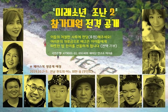 '미래소년 조난' 2기 멤버는 총 11명으로, 이들은 이날부터 1박 2일 24시간 동안 전남 완도에 있는 어느 외딴섬에서 생존에 도전할 예정이다. 재미난연구소는 '미래소년 조난' 2기 멤버들의 생존기를 공식 페이스북을 통해 생중계한다.