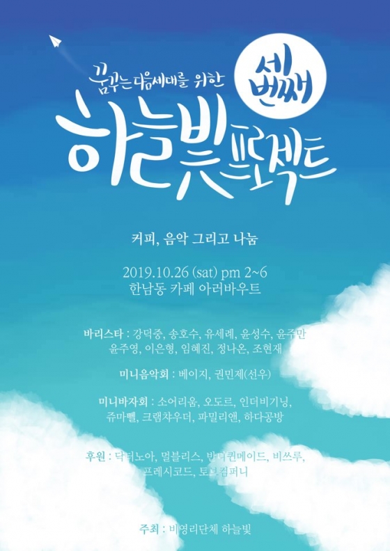 비영리단체 '하늘빛'이 주최하는 제3회 하늘빛 프로젝트가 오는 26일 오후 2시부터 6시까지 서울 한남동 카페 '아러바우트'와 '드라마스튜디오'에서 열린다. 문화, 엔터테인먼트의 전문가, 아티스트들이 모여 따뜻한 한 잔의 커피와 아름다운 음악을 선물할 예정이다. 일일 카페의 수익금은 전액 저소득가정 아이들과 청소년들의 장학금으로 사용된다.
