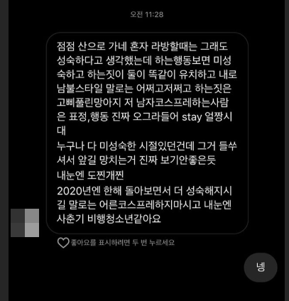 끝으로 그는 "2020년엔 한해 돌아보면서 더 성숙해지시길 말로는 어른 코스프레하지마시고 내 눈엔 사춘기 비행 청소년같아요"라고 전했다.