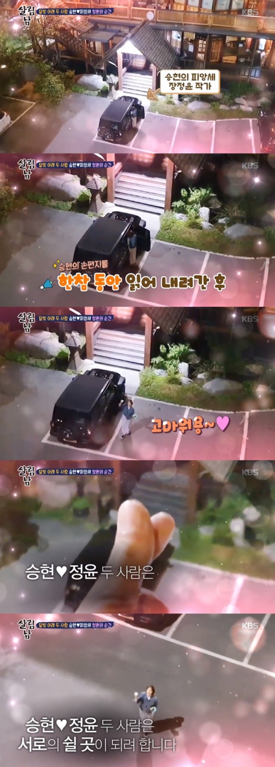 이와 함께 김승현의 프러포즈 모습이 담긴 개인 영상이 공개됐다. 영상 속 김승현은 자신의 차량 안에서 장정윤 작가에게 반지를 선물했고, 김승현이 "손 한 번 흔들어 달라" 하자 장정윤 작가는 김승현의 손편지를 한참 읽더니 멀리서 손을 흔들며 손하트와 함께 "고마워용"이라고 기뻐하는 모습을 보였다. 김승현도 기쁜 마음에 손가락 하트로 애정을 표현했다.