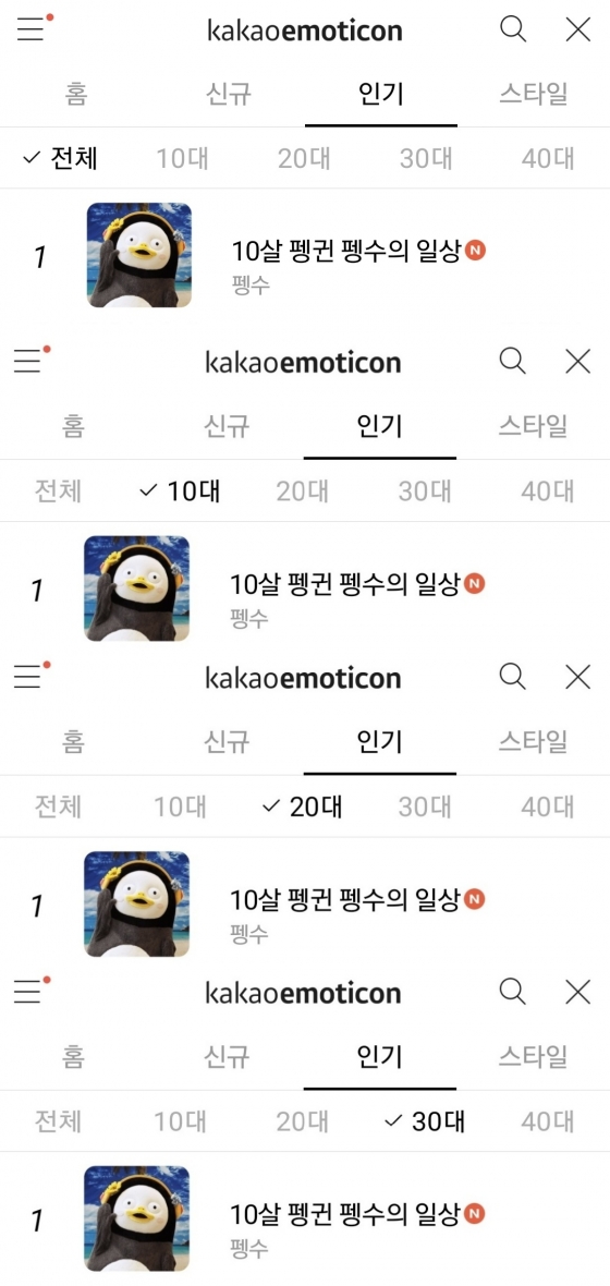 이에 대중들은 펭수의 이모티콘을 너나 할 것 없이 구입하고 있다. 14일 오후 1시 기준 펭수 이모티콘은 10대부터 30대까지 1위를 기록하고 있다. 전체 1위도 경신했다.