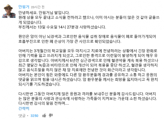 이어 "부친께서는 6년 전부터 심근경색으로 인해 혈관약을 계속 복용하였으나 최근 복용을 중단하였습니다. 음식 조절을 하지 않고 암 치료에만 전념한 것이 화근이라고 생각합니다"라며 "그동안 아버지께 많은 응원과 격려를 보내주신 분들께 감사드립니다"라고 전했다.