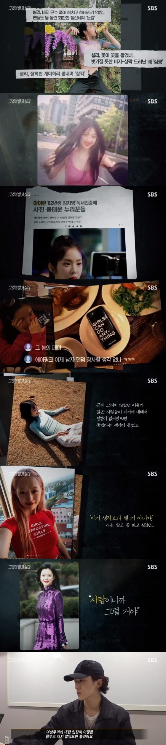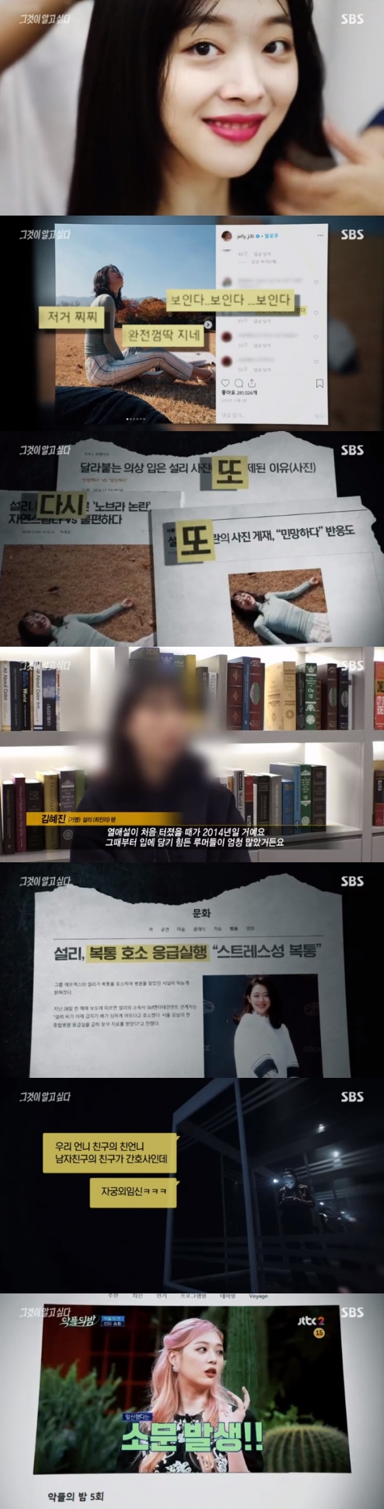 이날 방송은 지난해 설리가 "개강이다"라며 자신이 다니던 대학교 캠퍼스에서 평화롭게 누워있는 모습의 사진을 SNS에 게재했던 당시부터 시작했다. 해당글이 올라온 후 네티즌들은 상의 속옷을 착용하지 않은 '노브라' 상태의 설리를 향해 "저거 찌찌" "완전 껌딱지네" "보인다 보인다"라며 성희롱성 댓글을 남겼다.