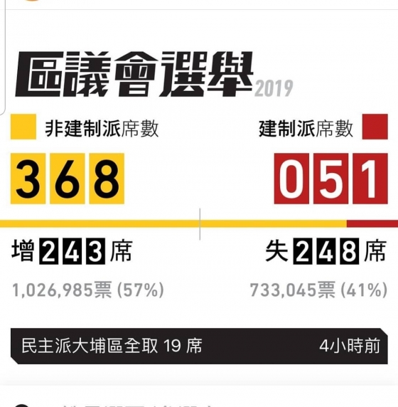 민주파 진영은 전체 18개 구의회 중 17곳의 과반 의석수를 확보하였으며 전체 의석수도 100석에서 350석 이상으로 불어나, 홍콩 선거 역사상 가장 압도적인 승리를 거두었다.