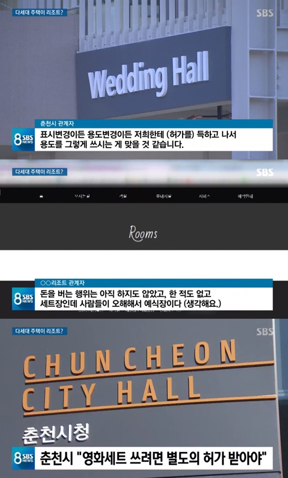2일 오후 SBS '8뉴스'은 강원도 춘천시 북한강변 옛 경춘선 철길 옆에 위치한 한 리조트가 임의로 용도 변경을 해 영업을 하고 있다고 보도했다.