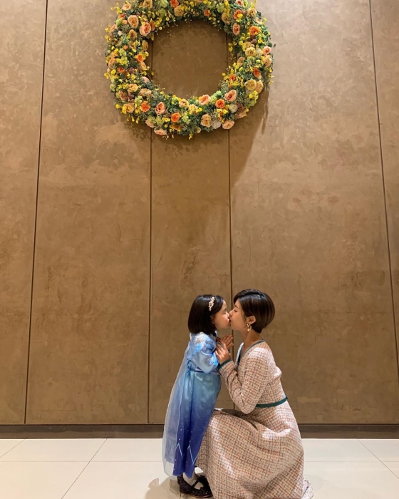 사진 속 이윤지는 딸 라니와 함께 큰 조화 리스 아래에서 뽀뽀를 하고 있다. 엘사 옷을 입은 라니의 귀여움과 이윤지의 사랑이 함께 보여 훈훈함을 보여주고 있다.