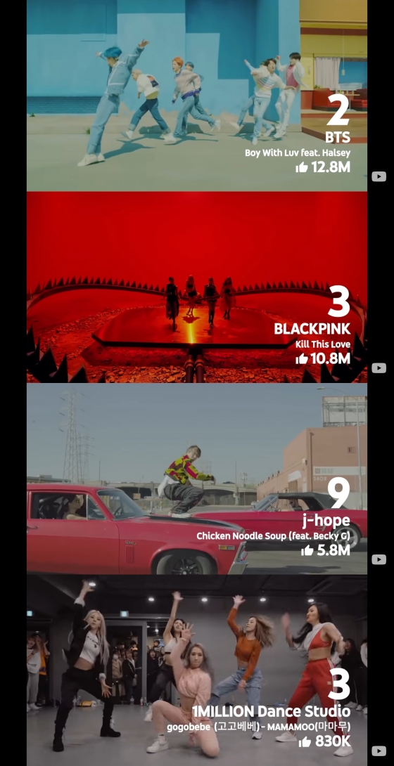가장 좋아요 수가 많은 뮤직비디오에는 ▲9위 방탄소년단(BTS) 멤버 제이홉(j-hope) '치킨 누들 수프(Chicken Noodle Soup (feat. Becky G)) 580만 ▲3위 블랙핑크(BLACKPINK) 'Kill This Love' 1080만 ▲2위 방탄소년단(BTS) 'Boy With Love (feat. Halsey) 1280만이 순위에 올랐다.